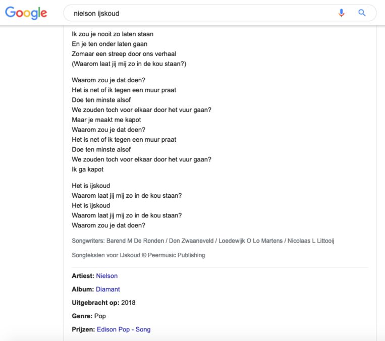 Nielson ijskoud (official video) (lyrics)ijskoud nielson het is ijskouden je woorden maken wolkjes in de luchteen rilling loopt een rondje op m'n rugal. Bekijk de songtekst ijskoud van nielson op songteksten.net. Kraantje pappie & tabitha (intro: / ismo / doe je mask off, hier doe we geen mask op / ik ben een baas tegelijk ook een mascot / we willen naar het