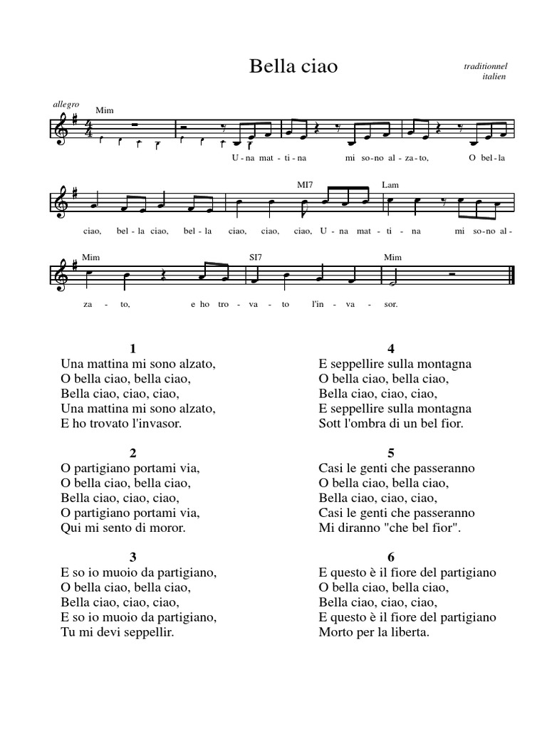 Bella ciao, Iran - YouTube from i.ytimg.com Una mattina mi son svegliato 1. Una mattina mi son svegliato, o bella ciao, bella ciao, bella ciao ciao ciao, una mattina mi son svegliato, e ho trovato l'invasor, o partigiano portami via, o bella ciao. Oct 05, 2020 · bella ciao: